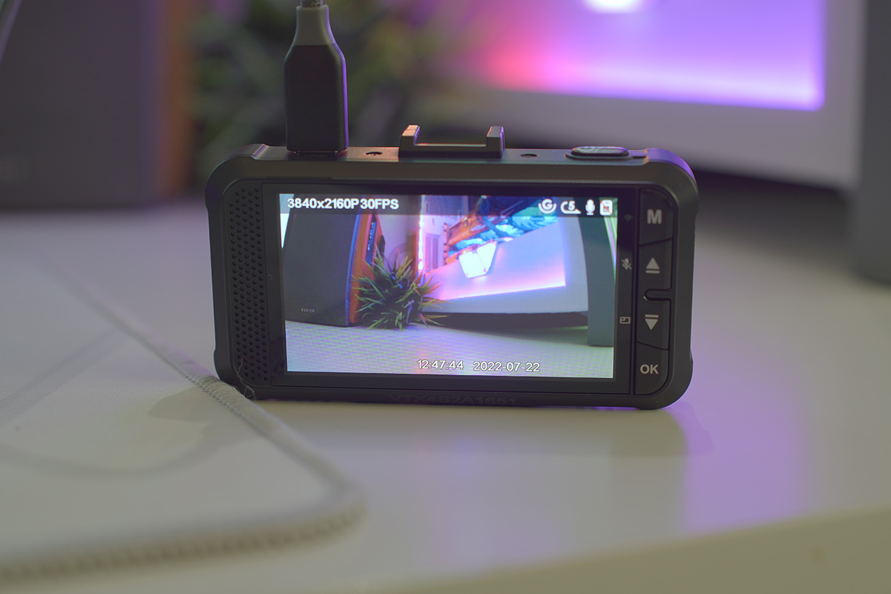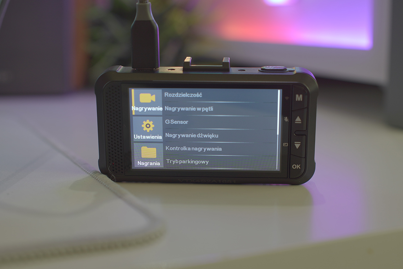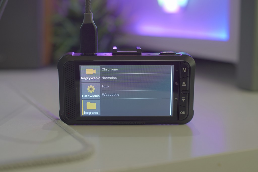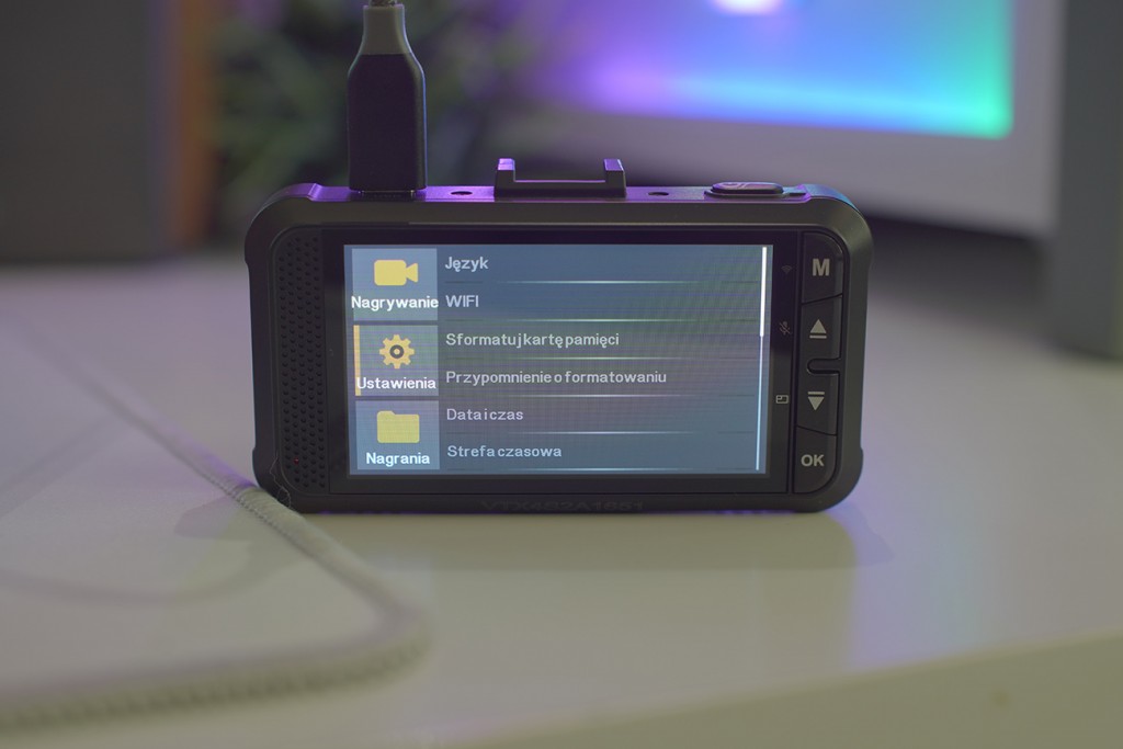 Tak wyglada Vantrue X4S od razu po wyjęciu z opakowania i trzeba przyznać ze jest to mała i lekka czarna skrzynka. Wykonana jest z już trochę lepszego plastiku, a spasowanie całości jest wzorowe. Nic tutaj w środku nie lata i nie gruchocze. Z lewej strony jest wejście na karty microSD do pojemnosci 256GB i taką albo 128gb sobie kupcie bo jakość i waga plików może was zaskoczyć. Na górze jest przycisk wyłączenia / włączenia rejestratora jak i jedno z dwóch portów USB gdzie możemy podpiąć zasilanie. Z tyłu mamy oczywiście wyświetlacz, to jest LCD o przekątnej 2.4 cala. Jest jasny i czytelny. Tutaj też, po lewej, mamy guziki dzięki którym nawigujemy po różnych opcjach kamery, a te w zupełności wystarczą 90% użytkowników. Natomiast dzięki temu ze mamy tu Wi-Fi to po ściągnięciu apki możecie fizycznie już nie dotykać kamery a z poziomu telefonu wszystkie te ustawienia zmieniać, co jest wygodnym rozwiązaniem.