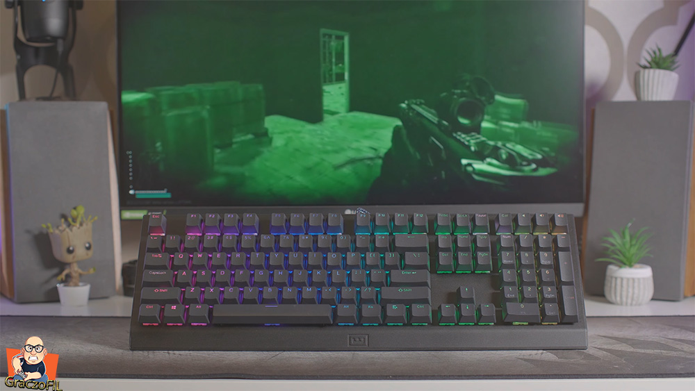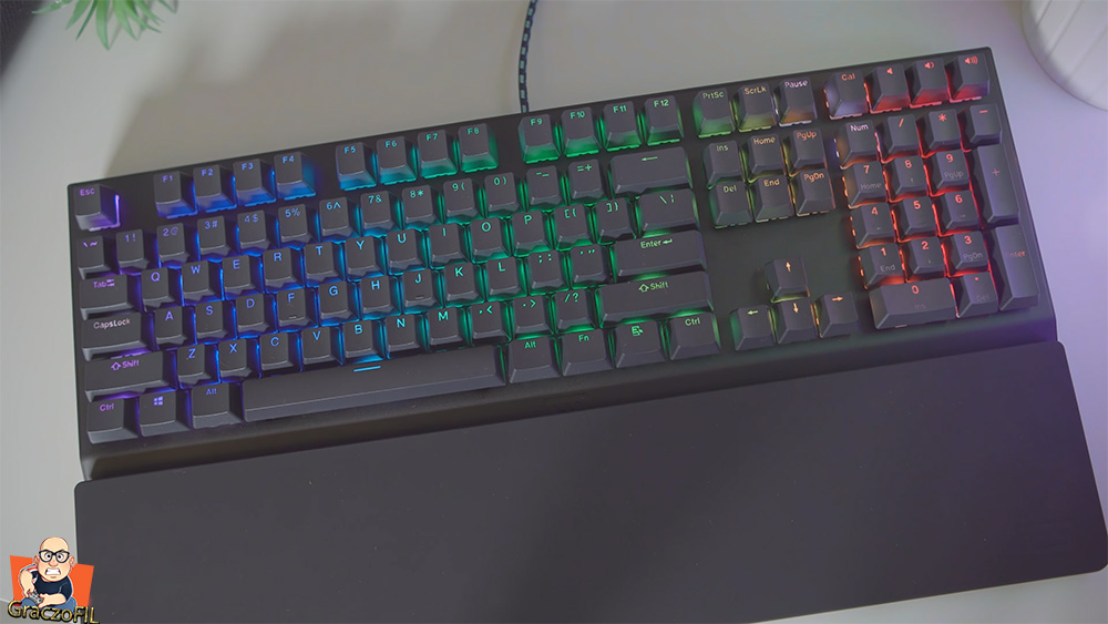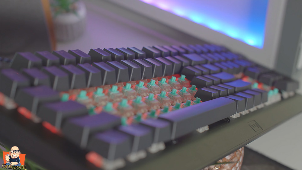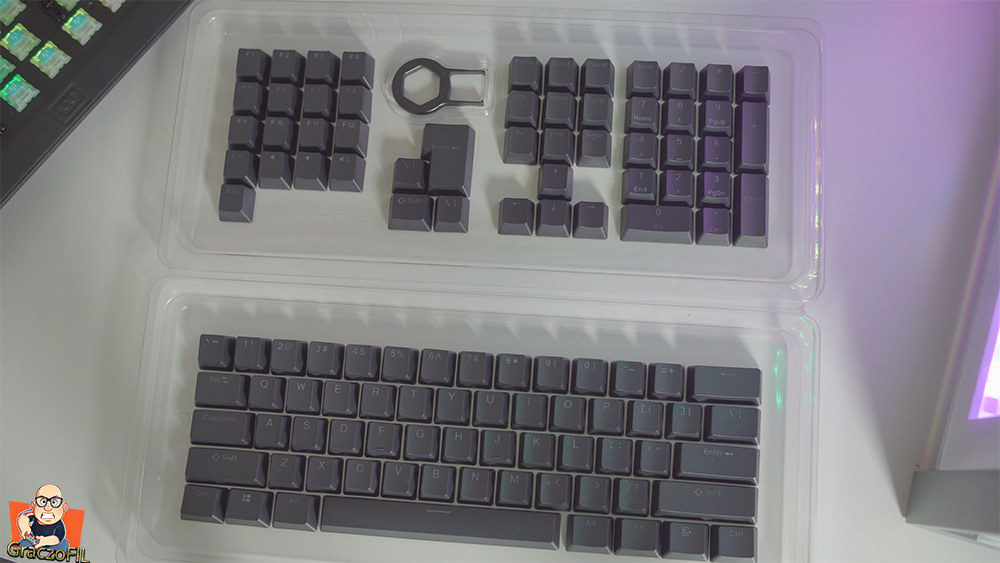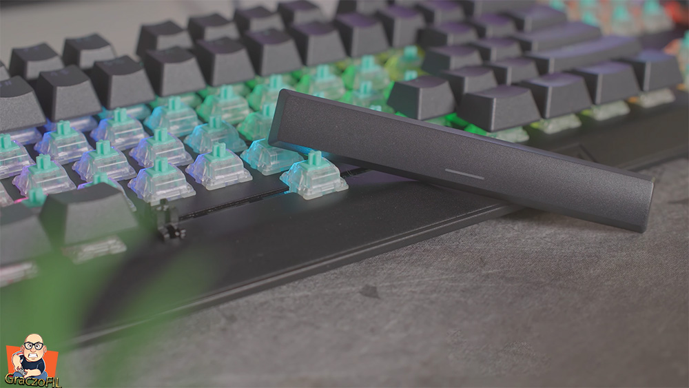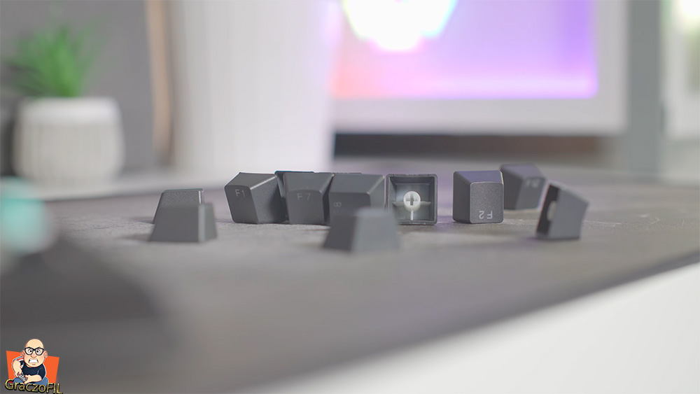 Podczas zakupu możemy sobie wybrać keypapy ABS’y albo PBT ja wybrałem gratisowe lekko śliniące pbtki – doubleshooty. Ich dizajn i czcionka minimalistyczna i nie nie krzyczy na nas ze to dla pro gejmerów pomimo ze wykonane są dobrze i na pewno lata użytkowania nic tu nie zetrze czy nie uszkodzi. Jeżeli nie znacie różnicy miedzy dwoma typami o których wspomniałem, wejdzie na stronę producenta tam macie świetnie napisany artykuł o tym – a bezpośredni link znajdziecie w opisie.