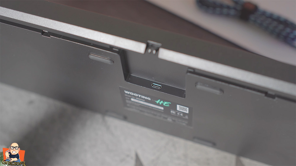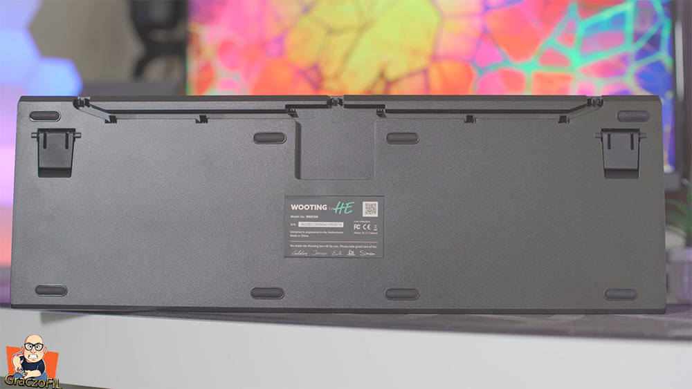 Tak wygląda sprzęt od razu po wyjęciu i co ciekawe nie ma założonych keycapow, tym sie jednak na razie nie przejmujecie. Jakość wykonania jest bardzo dobra. Wazy 950gramow wiec sporo, a wszystko za sprawa mocnego aluminiowego szkieletu. Spasowanie wszystkich 9 elementow z których sie składa jest świetne, nic tu nie trzeszczy, nie lata i nie wygina sie, a użyte materiały to górna pólka. Patrząc od spodu mamy az 10 mniejszych elementów przeciwpoślizgowych z czego dwie na wysuwanych podwyższających nóżkach. Nie zabrakło korytarzy dla naszego przewodu usb jak i na środku wlepka z unikalnym numerem seryjnym + male podziękowania na dole. Co ciekawe jak na produkt premium to niestety, ale mi zabrakło dodatkowego portu USB z tyłu – to przy cenie produktu powinno być już w standardzie. Wooting Two He w naszym teście palca spisał się dobrze, trzeba użyć sporej siły aby analoga przesunąć.