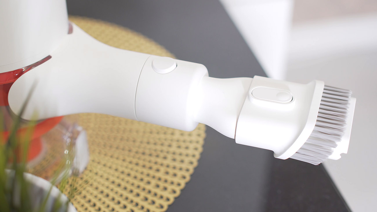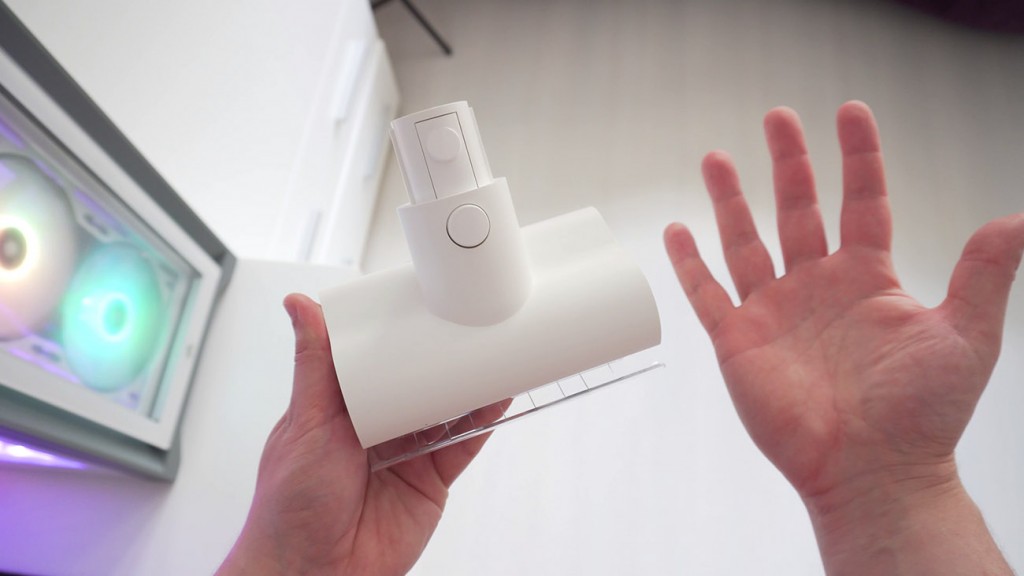 W zestawie mamy kilka przejscówek i nasadek, pierwsza – taka typoa do odkurzania jakis zakamarków czy siedzeń w samochodzie bez zadnego włosia, ale oczywiscie i z nim takze mamy. Ta zdecydowanie ma wiekszą powierzchnie wciagającą, bardziej podluzną i fajnie ze po wcisnieciu przycisku mozemy sobie włoski schować albo wyciągnąć. Super posluzy do np. wycierania klawiatury ale to wam pokaze pozniej. Tak wyglada uchwyt na sciane ktory będzie ladował odkurzacz. Z boku mamy wejscie na wczesniej pokazaną ładowarke, ale nie musimy z niej korzystac bo sprzet bezposrednio w sobie rowniez ma miejsce do ładowania – tak wiec wybór nalezy do was. Nie mogło zabraknąć dlugiej zwyklej rury i swoja droga wszystkie te akcesoria sa wykonane z mocnego i lekkiego tworzywa – spokojnie mozemy je obijac i na pewno nic sie z nimi nie stanie.