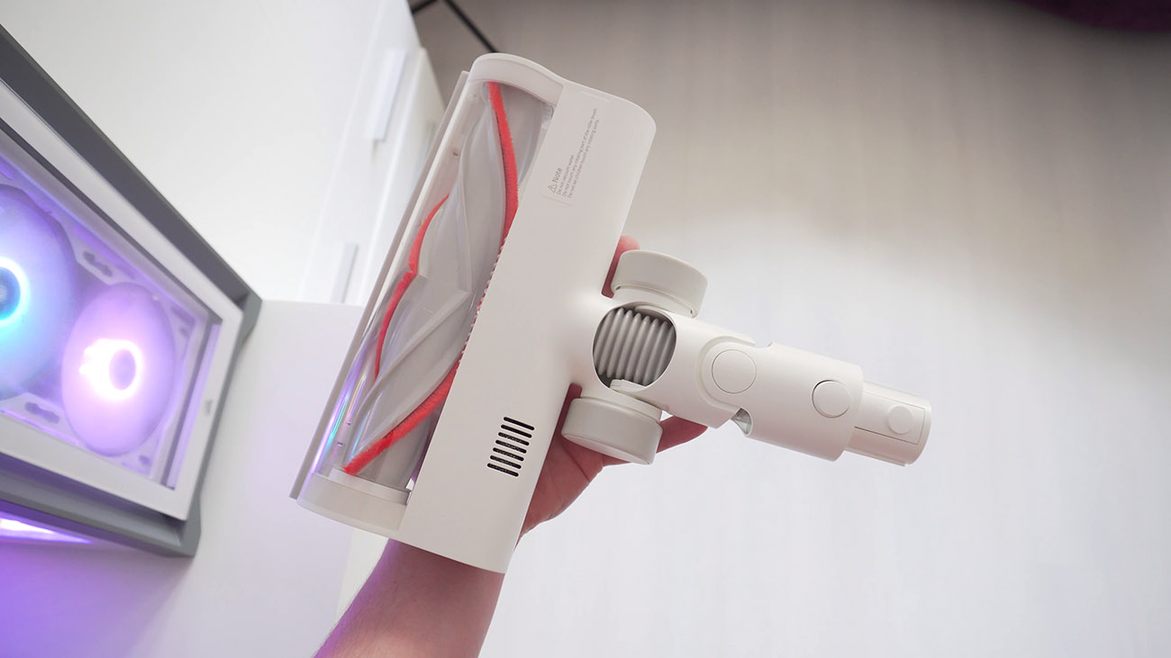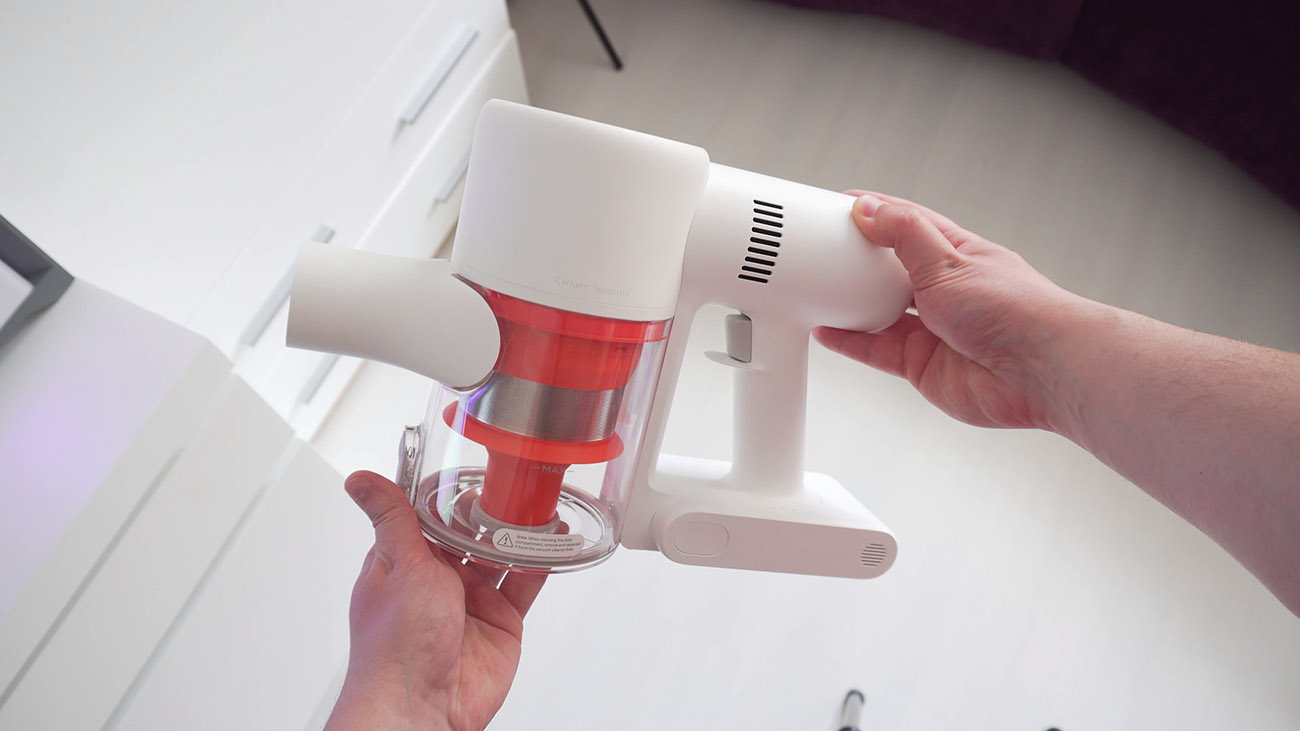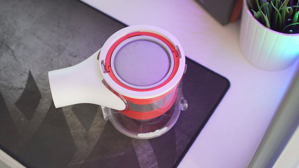 To nasz głowny element skrywający silnik o mocy 400W i mocy ssącej 120AW, a predkość silnika to 100.000 obr na min. Generalnie bardzo lekki sprzęt i wykonany jak wszystko z dobrego i mocnego plastiku. Xiaomi z tylu ulokowało 3 stopniową zmiane mocy, a na dole w rącze wejscie do ładowania. Niestety od razu zwrocilem uwage ze by włączyc sprzet i by ten pozostał aktywny to musimy ciagle trzymac palec na cynglu. Wtedy jak widzicie na dole na baterii zapalają się wskazniki jej nałądowania. Fajnie ze Urzadzenie jest wygądne i dobrze wyprofilowane do trzymania. Super prosta sprawa to oproznienie tego 0.6 litrowego zbiornika na bród – wystarczy ze wcisniemy guziczek a mocna sprezyna w ulamek sekundy zmieni polozenie i kurz sie wysypie.