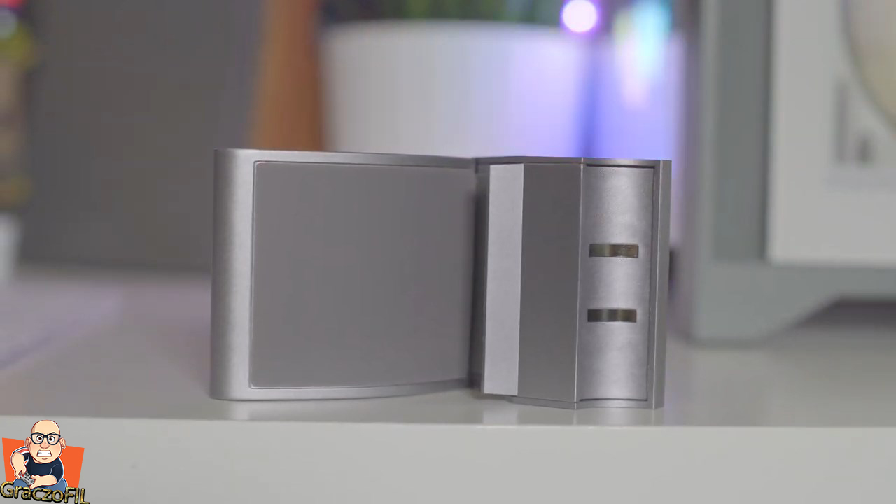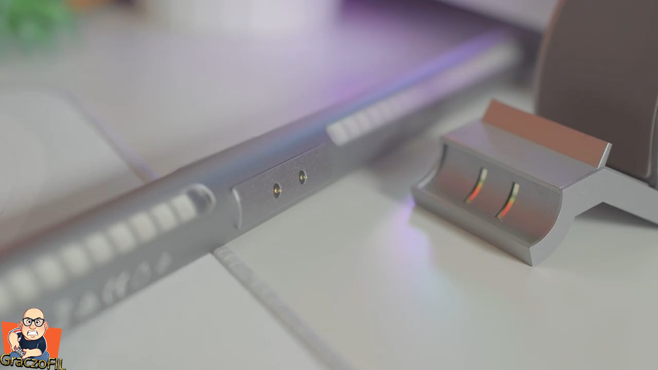 Tak wygląda sprzęt od razu po wyjęciu, czuć dobrą jakość dzięki zastosowaniu wysokiej klasy aluminium. Spasowanie wszystkich elementów jest wzorowe, a i waga niska bo około 100gramow. Dobrze ze wygląd jest stonowany, dzięki czemu na każdym monitorze będzie prezentować się nienagannie, jak i nie zachwieje ogólnej estetyki która mamy na biurku. Z frontu jak umieścimy lampę będziemy patrzeć jedynie na te szare aluminium i pośrodku skryło sie nam logo producenta, po przeciwglegl stronie mamy magnes który będzie współgrać z nasza podstawką no i zobaczcie jak mocno to się trzyma, nie ma szans by nawet przypadkiem jak zahaczymy by to nam sie rozłączyło. Tutaj tez może tego nie widać, ale mamy opcje regulować kąt nachylenia do 25°.