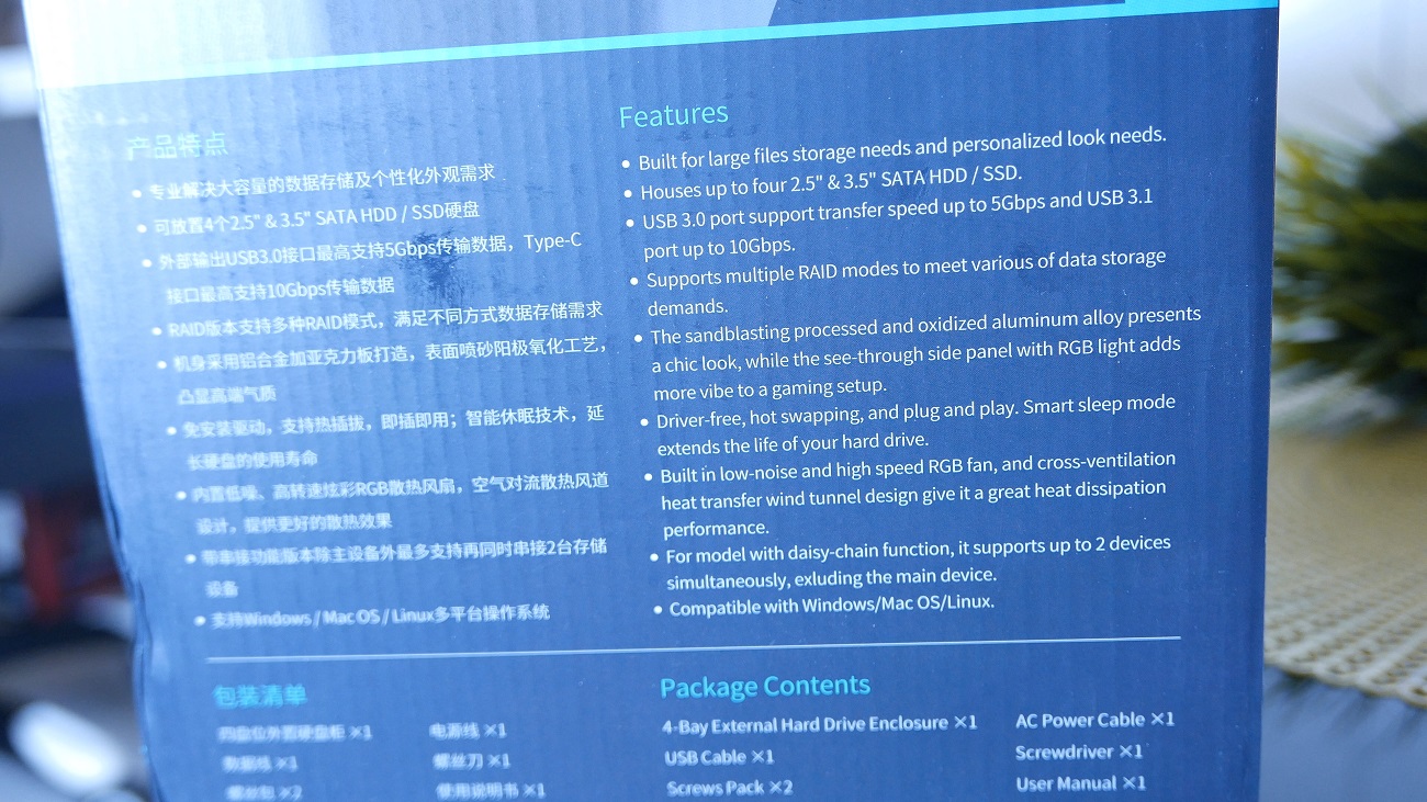 Yottamaster jest pakowany w dość dużym prostokątnym pudełku. Można zobaczyć zdjęcia produktu z opakowania i przeczytać niektóre jego funkcje i specyfikacje z boku i z tyłu. Wewnątrz pudełka znajduje się gruba pianka, która chroni sprzet oraz inne mniejsze pudełko, w którym znajdują się akcesoria. Oprócz samej obudowy pakiet zawiera: instrukcję obsługi; śruby mocujące do SSD, śruby mocujące do HDD; śrubokręt; kabel USB typu B do typu A oraz przewód zasilający. W zestawie nie ma (zewnętrznego) zasilania, ponieważ jest ona wbudowana w obudowę. To sprawia, że Yotomaster jest nieco cięższy w porównaniu z innymi zewnętrznymi obudowami, które nie mają wbudowanego zasilacza – ale jak dla mnie jest to plus, z reszta zależy od tego gdzie to będziecie wykorzystywać i jak.
