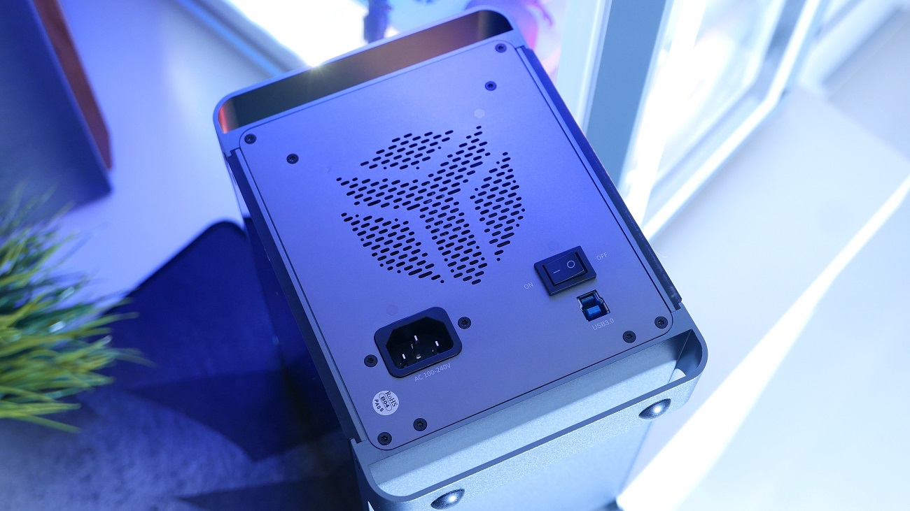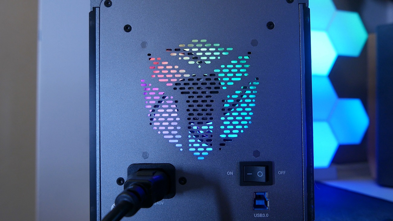 Obudowa ta wygląda stylowo i ma ładną estetykę. Projekt przypomina mi komputer stacjonarny Apple Power Mac G5. Na zewnątrz jest w większości metalowy, dzięki czemu jest bardzo mocny i wytrzymały. Natomiast jego boki pokryte są przezroczystym akrylowym panelem bocznym. Wnęki na napędy są ponumerowane, przy czym górna wnęka jest pierwszą. W przedniej części nie ma wskaźników LED ani żadnych przycisków. Z tyłu widać złącze zasilania, przełącznik DIP dla różnych trybów RAID (nie w tej wersji!), przełącznik zasilania i port USB 3.0 typu B. Z tyłu nie widać wentylatora RGB 80 mm, ale widać perforowane logo Yottamaster, przez które wydmuchiwane jest gorące powietrze. Niestety nie możesz kontrolować ani zmieniać prędkości i koloru wentylatora. Ma jeden efekt kolorystyczny „rainbow”. Tace dla każdego dysku wydają się dobrze skonstruowane. Aby wyjąć tacę, po prostu przesuń blokadę, a uchwyt wyskoczy. Ta „tacka” jest trochę niewygodna do pociągnięcia i czuję, że jeśli użytkownik nie będzie ostrożna lub będzie ją ciągnąć na siłę, może w pewnym momencie pęknąć – ale jak na spokojnie do tego podejdziemy to nie ma takiej opcji, bo wszystko tu działa bardzo płynnie.