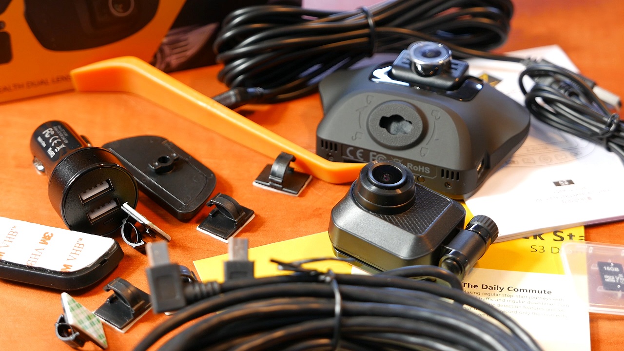 Front opakowania to zółto czarne pudelko z dwoma obrazkami naszych czarnych skrzynek i krótka informacje ze sprzet jest dyskretny, to po bokach znajdziemy kilka detali technicznych jak np. to ze obie kamery maja 150 stopniowy kont nagrywania. Sprzet i jego akcesoria sa bardzo dobrze zapakowane i otulone styropianem na czas podrozy. W srodku poza głownym daniem znajdziemy, krotki i dlugi kabel micro USB do głownej kamery, jest tez conajmniej 3metrowy przewód którym łączymy obydwa rejestratory, sa tez takie klipsy z klejem by te przewody ladnie poukladac w aucie aby nie wisialy nam nad głową, jak kamere zamowimy z oficjalnej strony dostaniemy tez karte SD o pojemnosci 16gb. W Srodku rowniez znajdziemy podziekowanie za zakup i informacje ze jak zarejstrujemy swoj produkt wydluzy nam sie okres gwarancyjny, jest tez skrocona i kolorowa instrukcja obslugi samego urzadzenia jak i mniejsza czarno biala wersja ktora zawiera wiecej informacji i detali. Dostajemy tez dwie przyssawki do naszego glownego rejestratora i szkoda tutaj ze producent nie dorzucil zapasowej przyssawki do tylniej kamerki. Ostatnimi dodatkami są zarowno przejsciowka ktora wtykamy w gniazdo popielniczki z wyjsciem na dwa USB jak i łopatka do podwazania elementów auta by umiescic kable bezproblemowo. Sami przyznacie calkiem sporo tego.